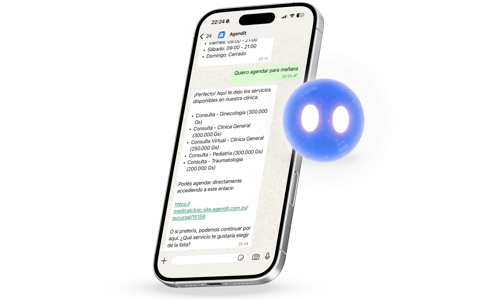 Tus clientes pueden agendar citas en cualquier momento, directo desde el WhatsApp de tu negocio.